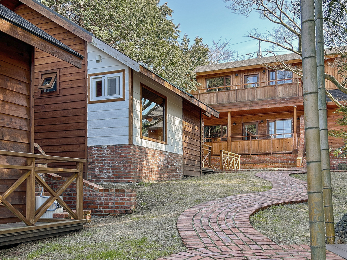 유럽여행지의 시골을 간접체험하고 싶다면 조천읍 바로 여기 글로리야다. 옛날 우리 어릴적 읽었던 동화책에서나 볼법한 그림같은 집이 실사화가 된다면 이런집이 아닐까. 초록빛이 강렬한 시원한오름들 사이에 위치한 글로리야는 클라이언트가 소비자에게 전달하려는 메세지가 무엇인지 아주 명백히 드러나있다. 네비를 찍고 이곳에 도착을 해 차안에서 내리기도 채 전에 유럽 시골 어느숲속의 깊숙히 자리한 나무집이 기다리고있다. 제재목이 풍부하게 외관을 뚤러싸고 있고 아스팔트 슁글의 지붕이 가담하여 자연과 조화를 이룬다. 주변에 조경이 한가득한 그 사이 어딘가에 자리한 글로리야가 자연스럽게 이어지고 있다.