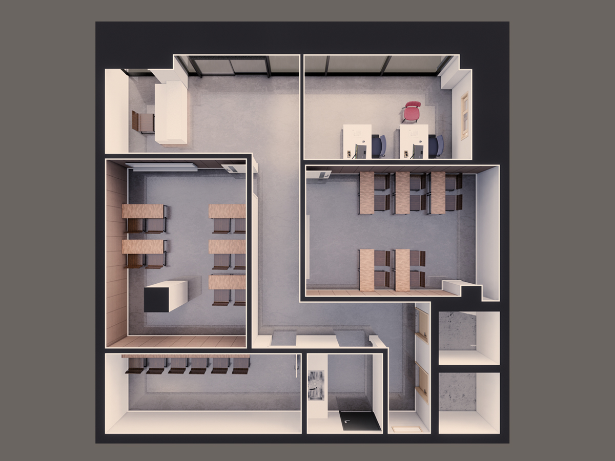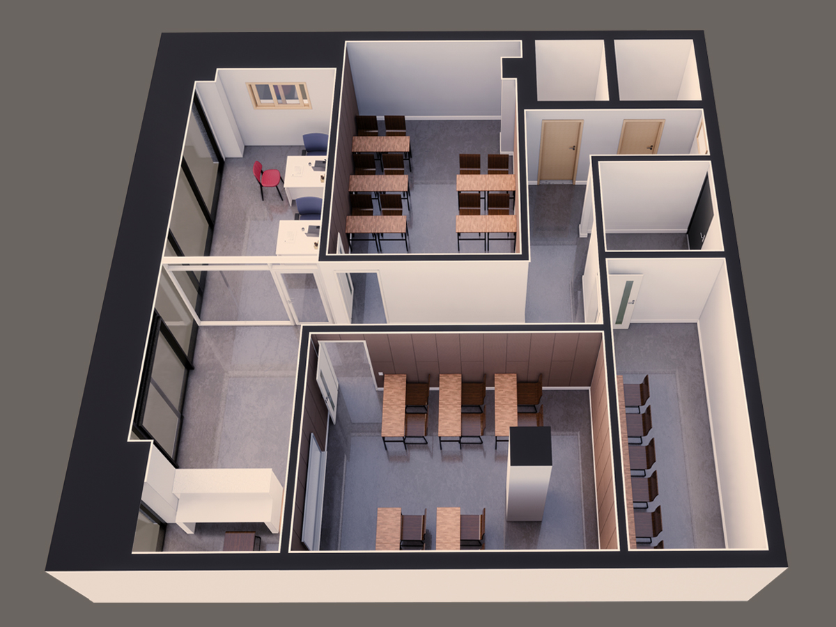 - 여기는 장전리에 위치한 어느 한 학원이다. 주출입구 옆에 카운터를 배치함으로 출입하는 학생들과 선생님과의 오가는 소통을 좀 더 수월하도록 배치 하였다. 학생들이 쉬어 갈 수 있는 휴게공간도 벽을 마주하는 형식으로 책상을 배치하여 예습/복습하는데에 학생들과의 간섭이 생기지않도록 하였다.