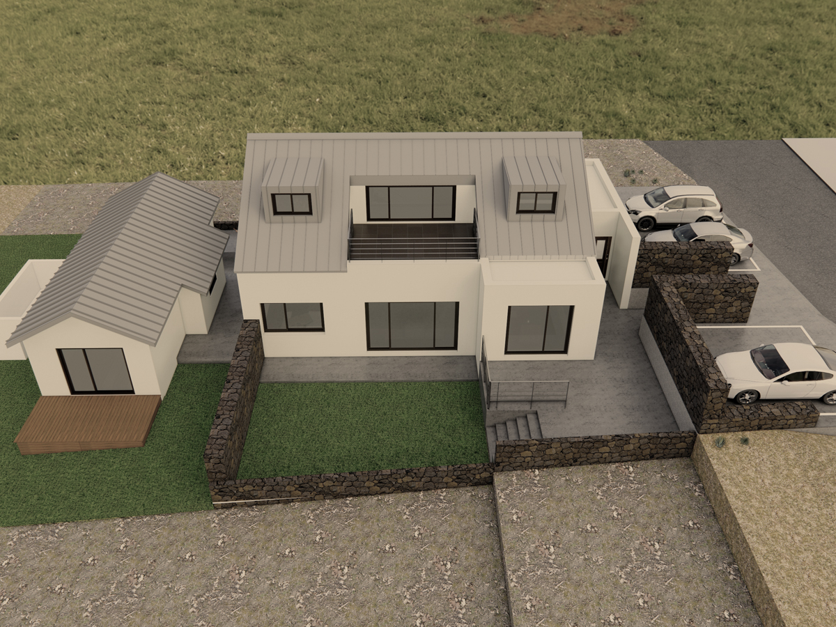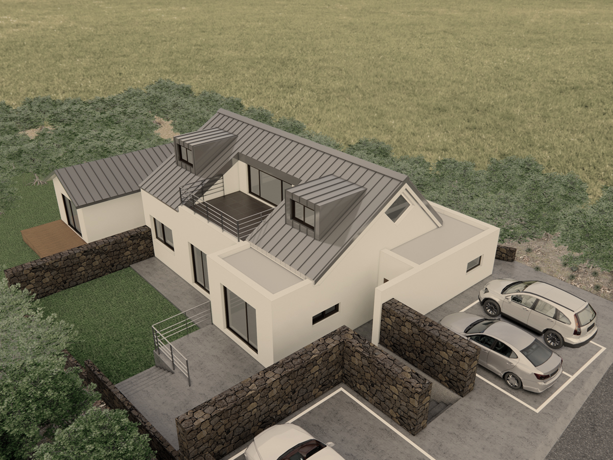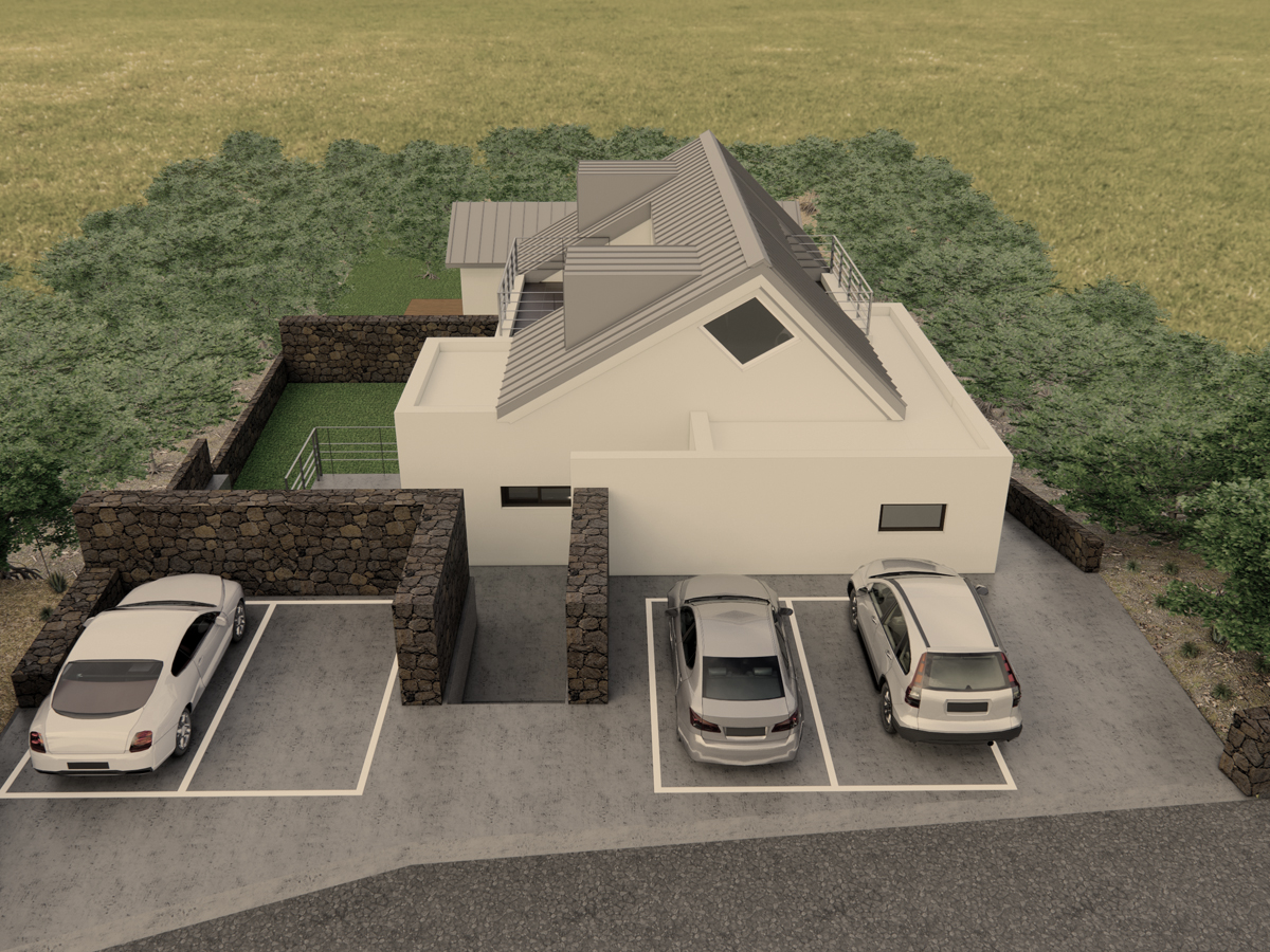 모델링을 함에 있어 실제같은 느낌을 반영 시키는게 주목적이기에 경사로까지 표현해냈다. 그덕에 클라이언트와 미팅을 하는데에 있어 토목공사시 필요한 부분들을 가지고 원활한 소통이 이루어졌다. 현재 펜션을 운영하고 있는데, 실제로 대지 바깥에 귤나무들이 무성한 귤밭에서 체험하기 까지 하고 있다. 처음부터 그것을 계획하고 있던 클라이언트였던지라 우리 또한 나무들을 갖다가 무성하게 배치하였다.