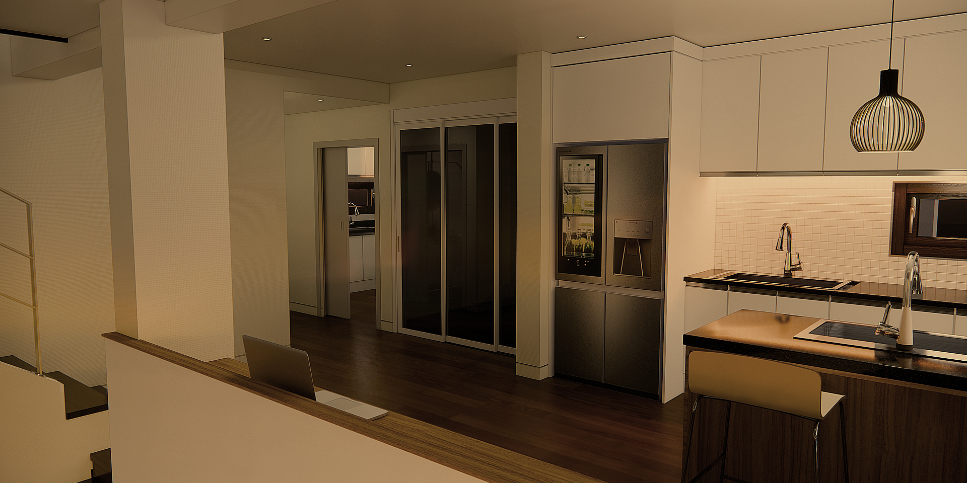 제주도만이 갖고있는 물부엌. 부부인 클라이언트 중 낚시가 취미라던 남성의 요구사항에 맞춰 동선을 최소화하기 위해 물부엌을 현관 바로 옆으로 설계를 하였으며, 낚시복장은 물부엌 바로 앞에 있는 욕실에서 바로 옆에 구성되어있는 세탁실로 크고 긴 관이 연결되어 빨래감을 그곳으로 넣으면 세탁기에 알아서 빠질 수 있도록 하였다.
