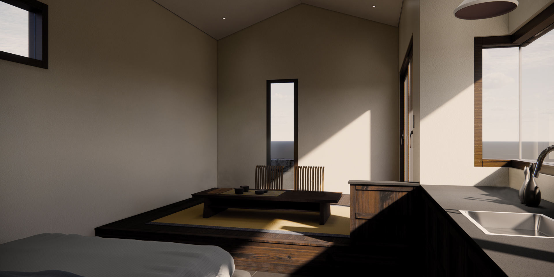 실내에는 평상이 두개로 분리가 되어있고 자체제작들어가는 싱크대와 그 맞은편에는 평상 위 침구가 들어서있고 그 옆에는 실내 한가득히 또다른 평상을 제작하여 그공간에서 다도를 할 수 있는 공간을 마련하였다. 평상에 오르내리는데에 편의를 위한 돌판을 구비하였고 간접등까지 설치하여 공간의 무드를 더했다.