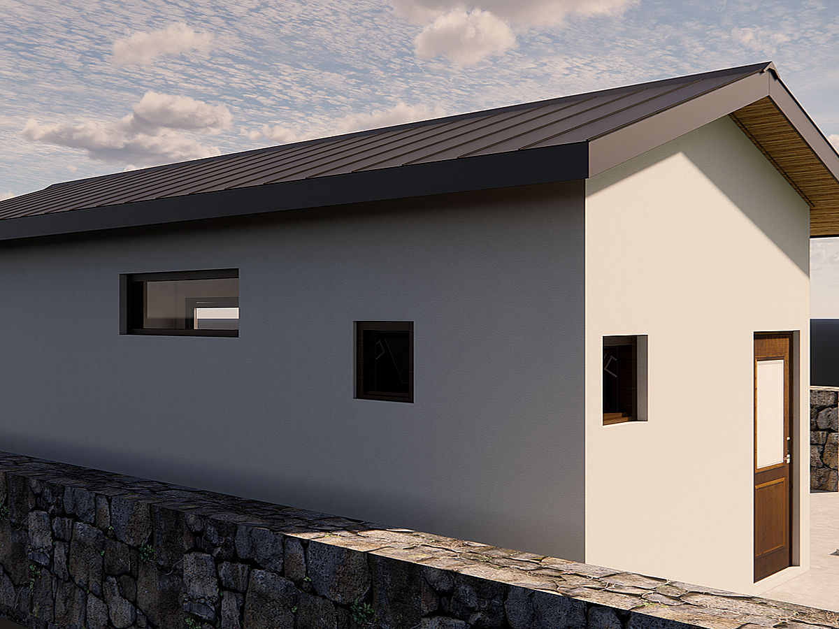 오로지 선으로만 갖춰져있는 도면 파일을 3D 프로그램에 옮긴 후 대지 경계선을 기준으로 면을 형성하여 돌담도 올려 외부를 형성하는 등의 시작으로 건물의 외관 또한 입면도를 참조하여 건물 한채 한채를 그렇게 완성해 나간다. 제주우의 창호를 보면 우드 필름이 씌워져있는 점이 눈에 띌 것이다. 클라이언트가 창호 필름을 선택을 하면 우리는 태양빛 및 조도를 계속해서 비교해내며 그에 따른 비슷한 텍스처와 색상을 만들어낸다.