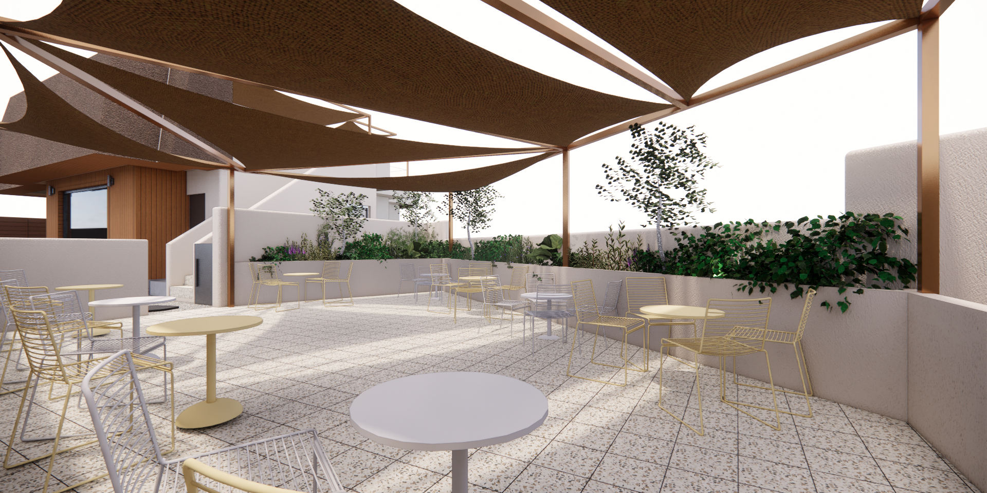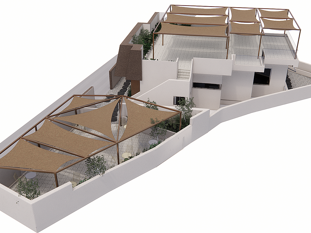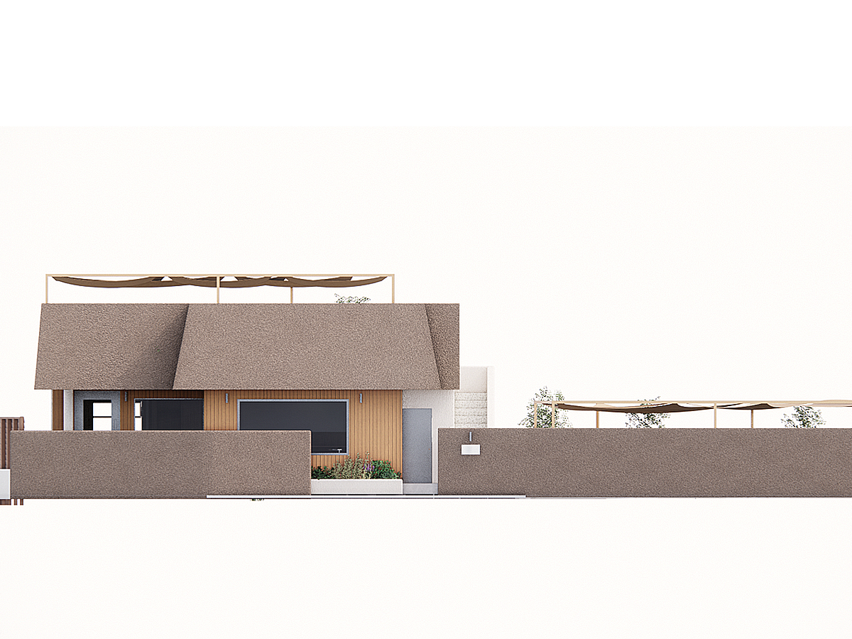 전면의 하단에 화단과 옆마당에는 담장 너머로 보이는 키큰조경들이 크도의 이미지의 생기발랄함을 부여하였다. 클라이언트는 스테인레스 창호 설치하기를 원하여 이미지로 표현화 하였고, 그 창호안에서 커피를 마실 고객들의 눈높이에 걸리지않을 담장의 높이 또한 이작업을 통해 결정지을 수 있었다.