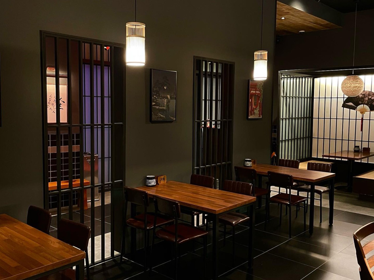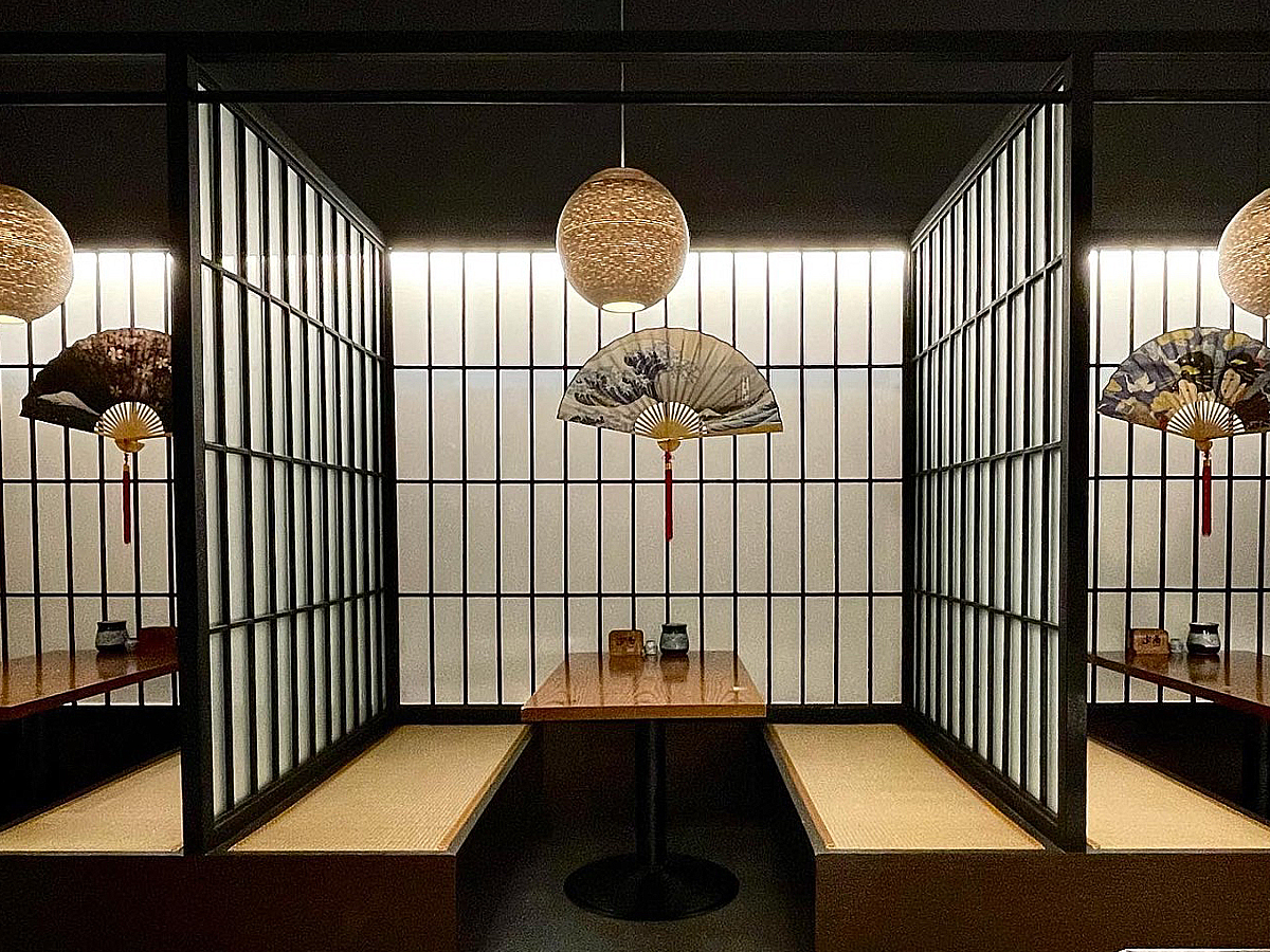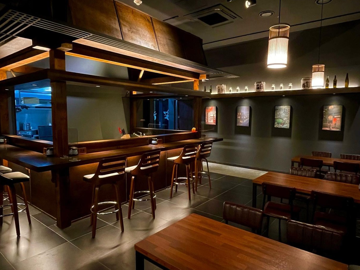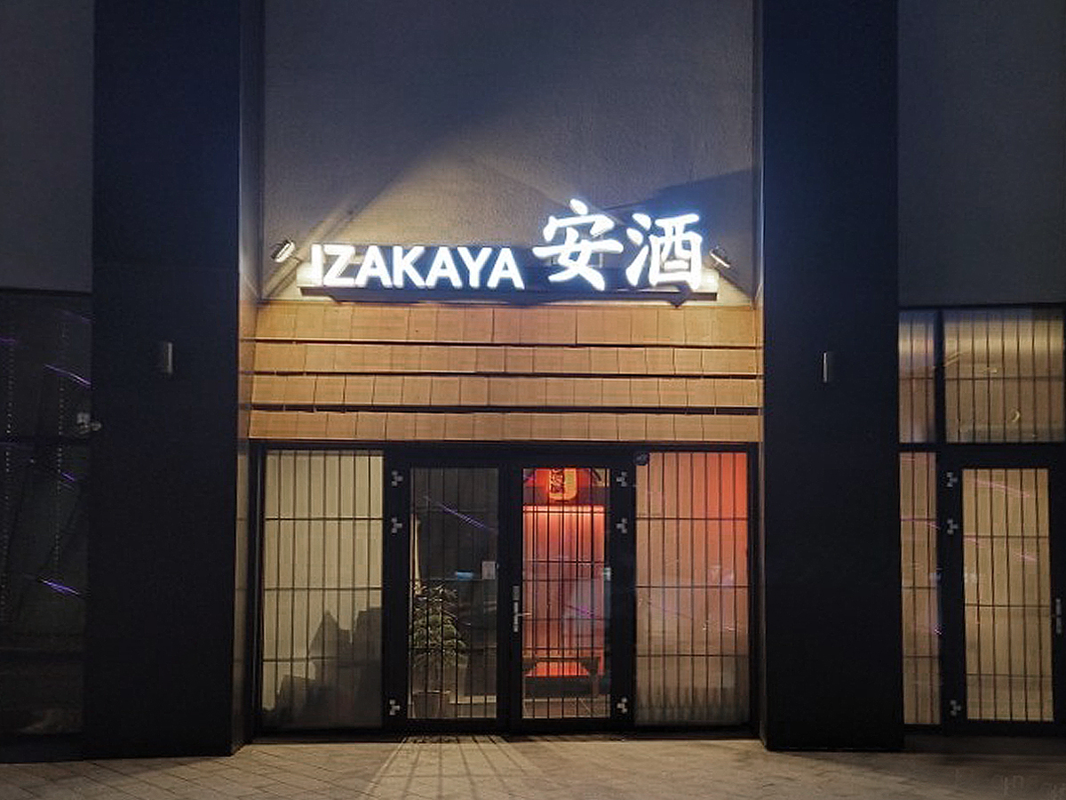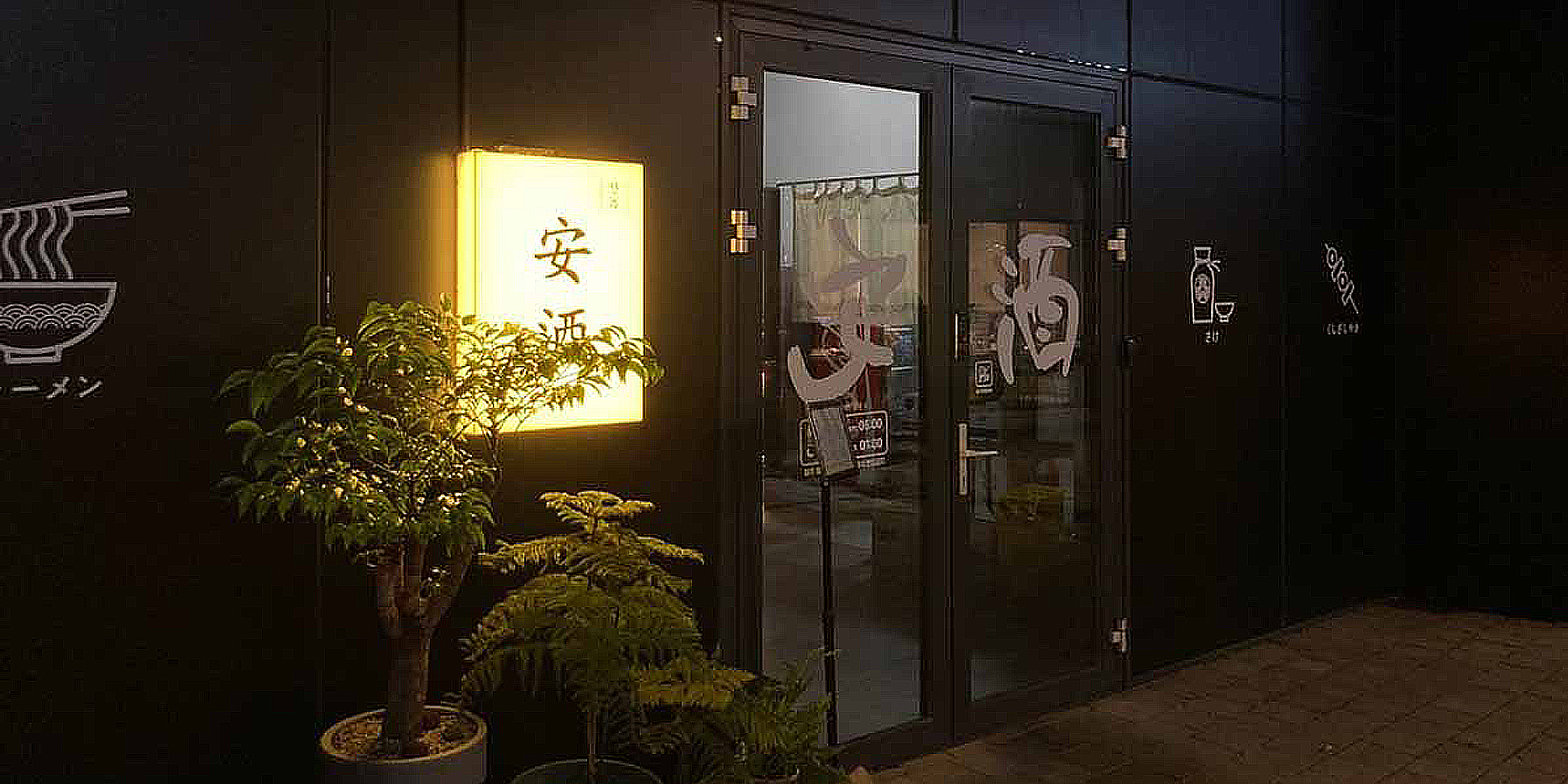 밤에 영업하는 음식점으로서 목재의 너와와 유리도어의 검정 프레임의 조화는 밤에 은은하게 전구빛이 더욱이 분위기를 살려내는데에 있어 시너지효과를 발한다. 유리도어에 간살을 더하여 이자카야 다움을 극대화하였다.