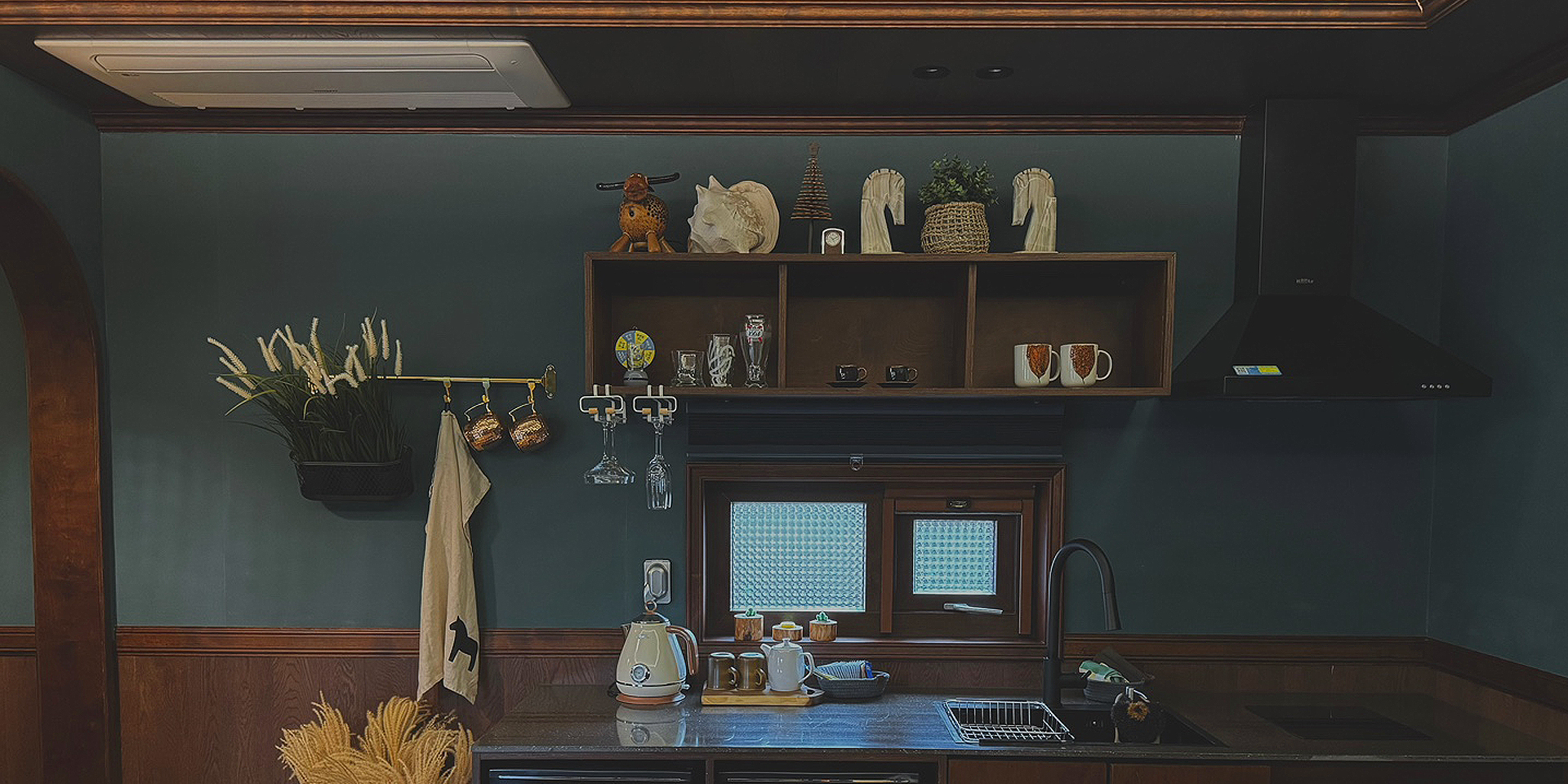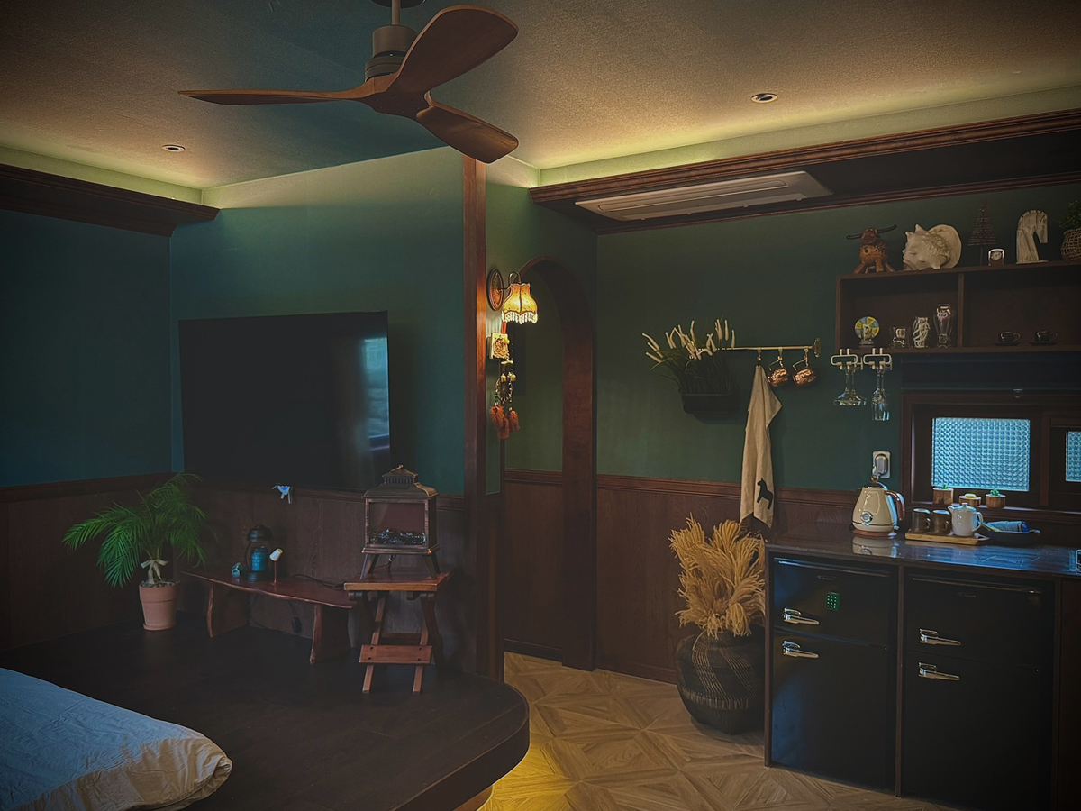 내부로 들어서면 짙은 초록색과 따뜻한 합판의 벽체가 어우러져 아늑하고 편안한 분위기를 연출한다. 특히, 우물천정 형태로 디자인된 공간은 크라운 몰딩으로 마감되어 있어 엔틱함과 고급미을 발산하고 있으며, 간접등이 부드러운 조명을 만들어 한층 더 아늑한 느낌을 준다. 이곳에서의 휴식은 마치 자연과 하나가 된 듯한 기분을 느끼게 한다.