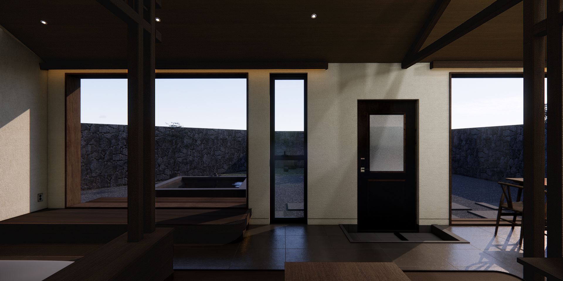고전적인 일본식 가구에 현대적인 재질과 디자인을 접목하여 독창적인 공간을 창출하는 방식으로 첫시안에서 도코노마와 욕실문을 강조하였는데, 쇼지(障子)라 불리는 일명 '간살문'으로 설계를 하였었다. 이로서 일본 전통의 미를 현대에서 재해석하려 하였으나 이 후 여러번의 수정 끝에 도코노마를 대신하여 그자리에 현재 침구자리가 들어선 것이다.