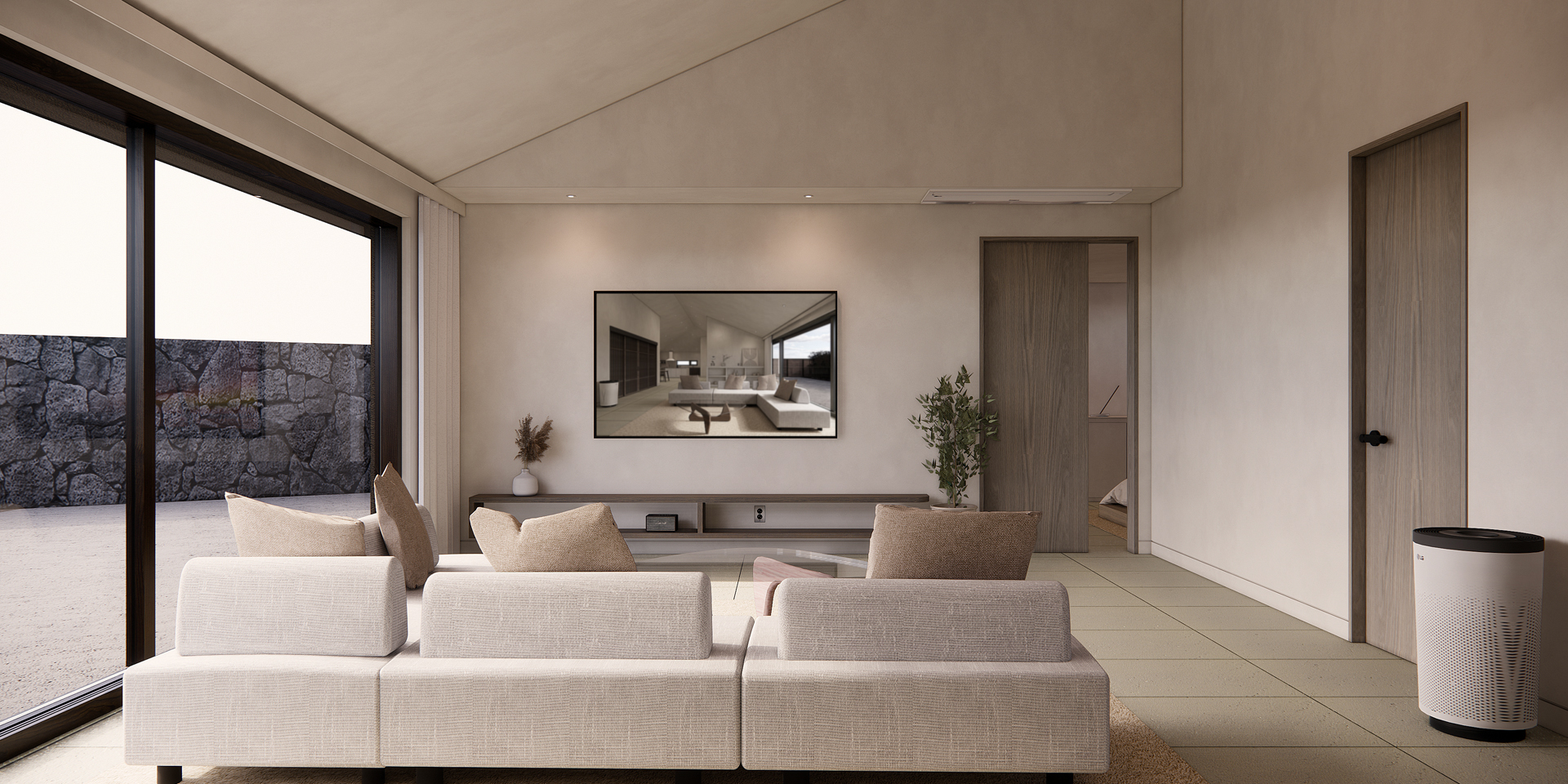 이 집은 넓은 오픈 플랜 구조로 설계되어 있다. 거실, 주방, 식사 공간이 자연스럽게 연결되어 있으며, 공간이 확장된 느낌을 준다. 천장 높은 창문을 통해 풍부한 자연광이 유입되어 실내를 밝고 쾌적하게 만들어 주며, 마이크로시멘트의 부드러운 질감과 함께 아늑한 느낌을 강조하였다.