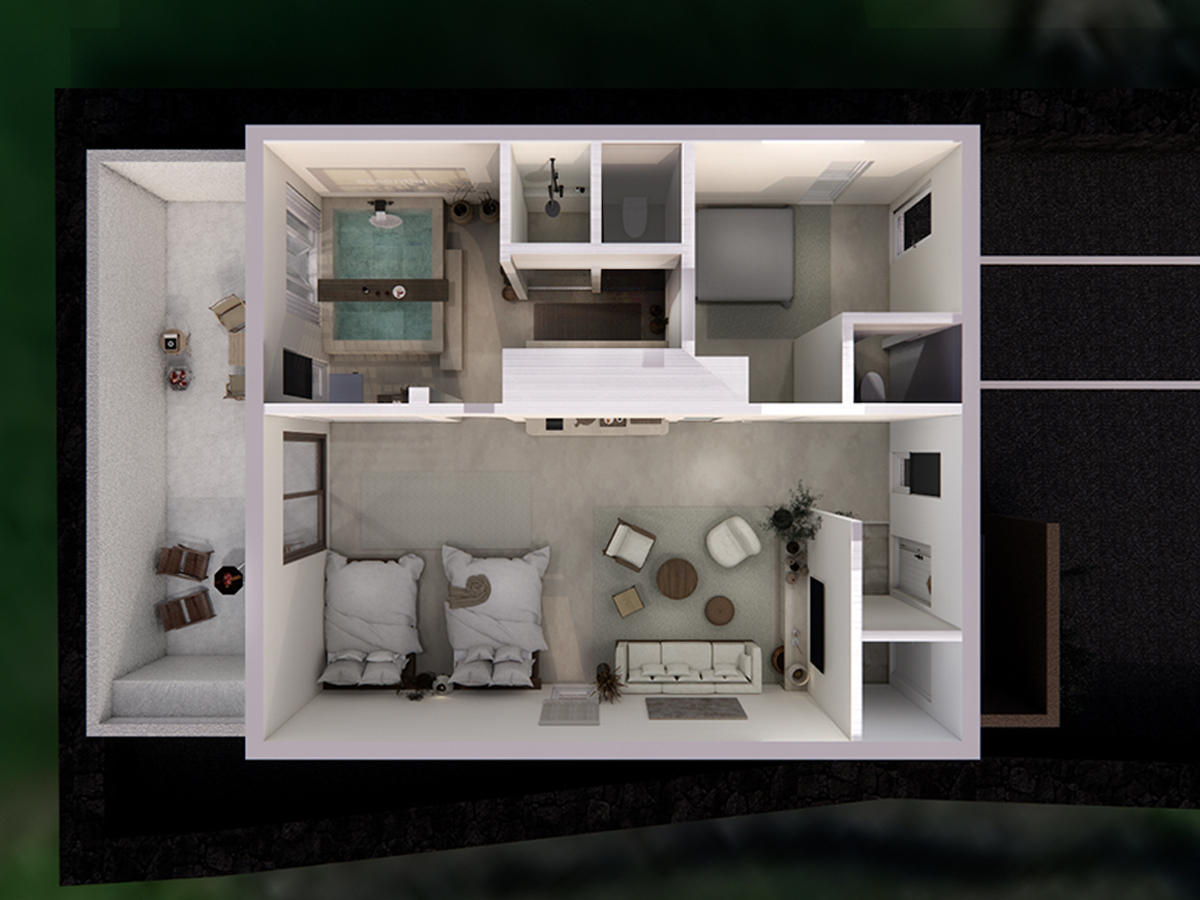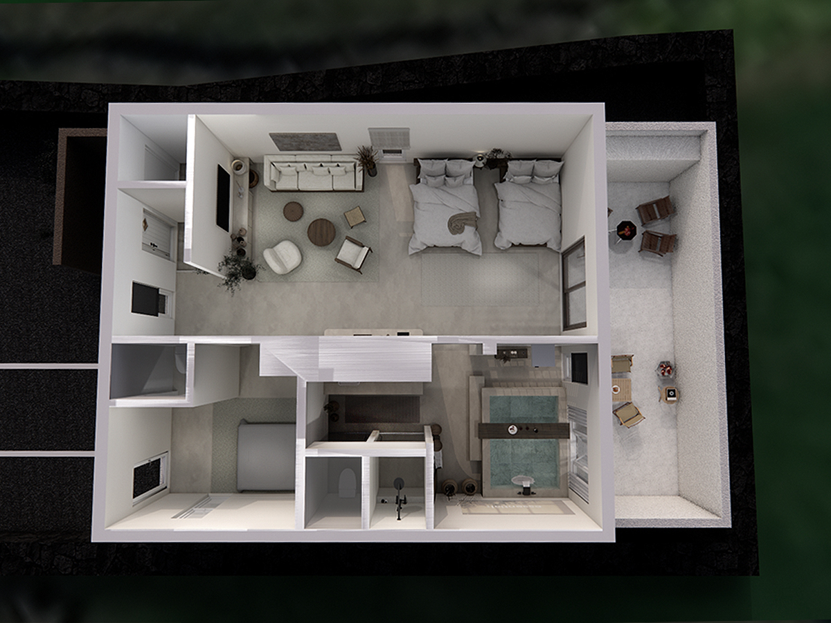 구조적인 면으로는 명확하게 '주방'이라는 느낌을 덜어내어 거실 및 침실과 한 공간으로 이루도록 한 오픈플랜형식이며, 그안에서 모든것들이 한공간안에서 이루어진다. 주방은 '싱크'의 개념보다는 '선반'이라는 일상적인 느낌으로, 여기에 마이크로시멘트로 마감처리를하여 바닥과 일체감을 형성시켜나갔다. 세면대 또한 마찬가지이다. 욕실이라고 꼭 바닥은 타일을 해야한다는 법은 없다. 그 공간 또한 마이크로 시멘트로 통일감을 주었다.