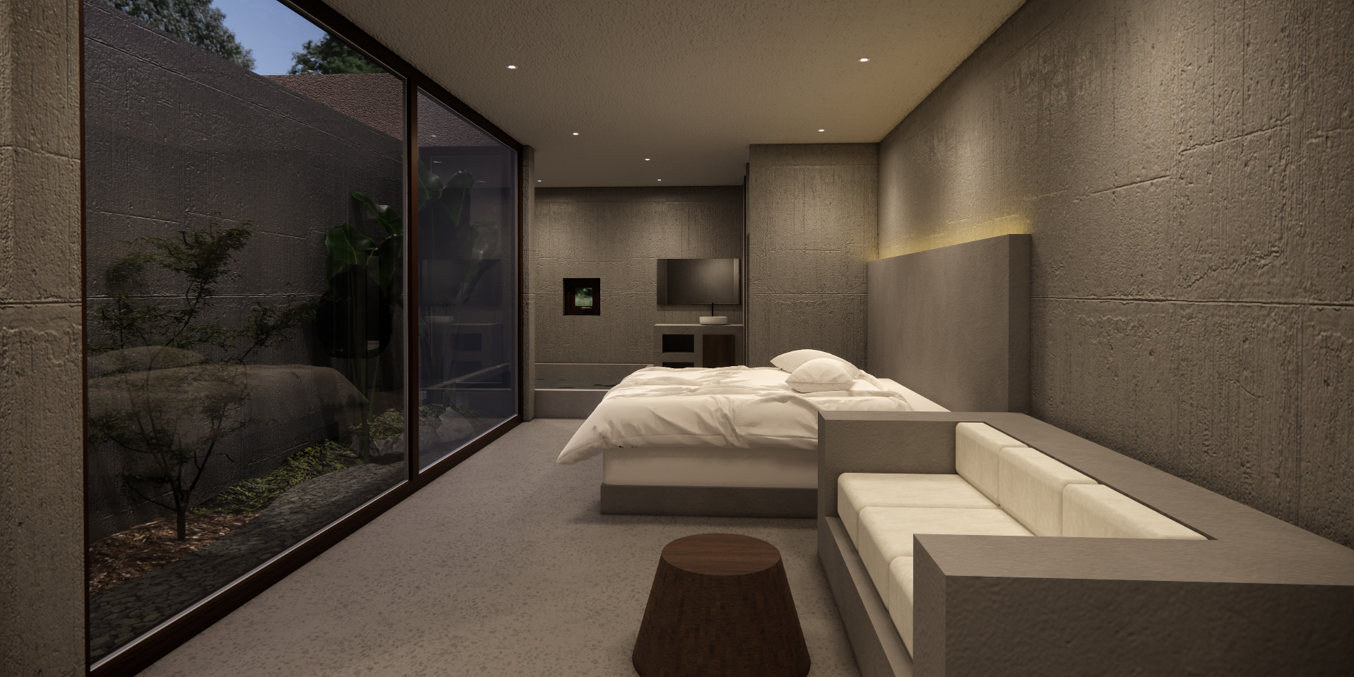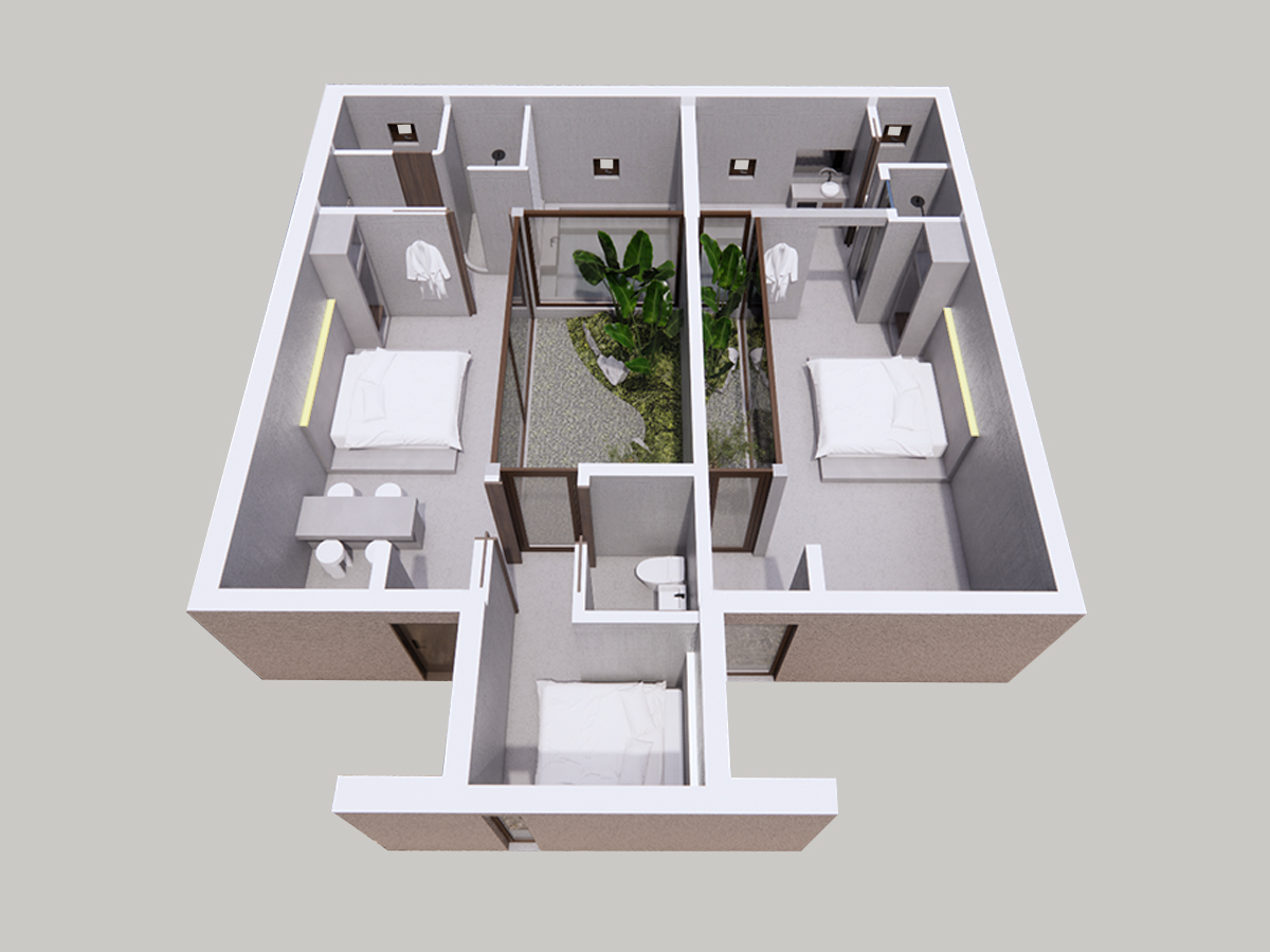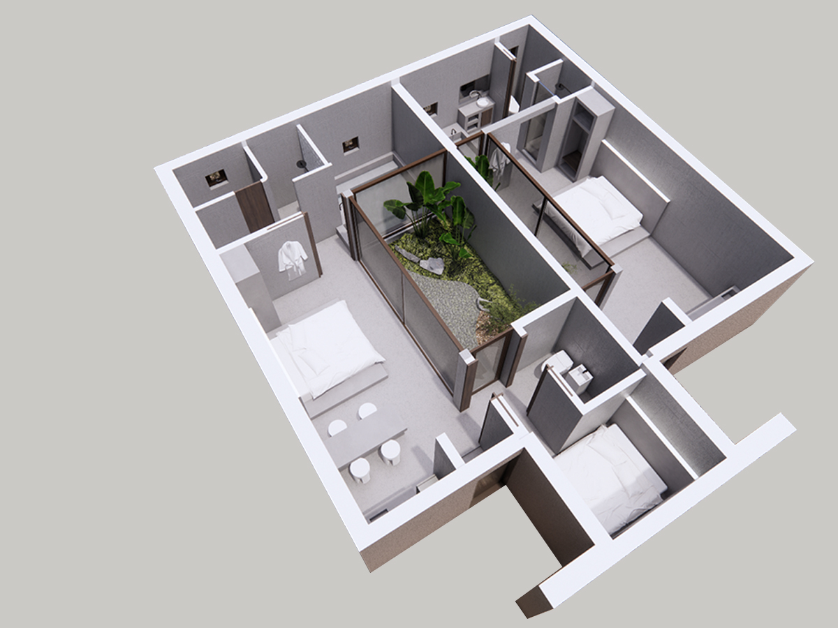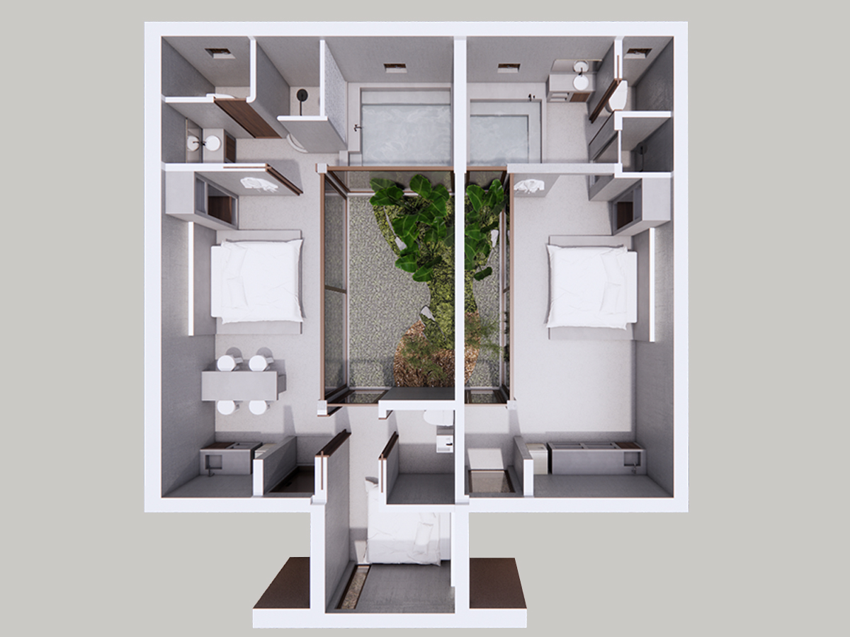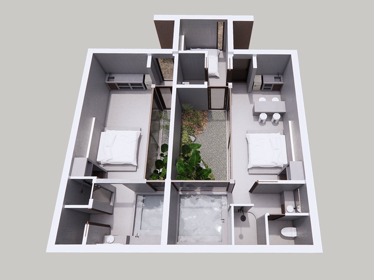 대지 위에 건물이 한 채이지만, 두채같은 이곳은 조경공간을 마련해둔 중정이 이건물에 제일 핵심요소이다. 오픈플랜구조의 자쿠지와 세면공간 및 가림막은 있지만 샤워실 등 침실과 주방 등과 모두 한공간으로 이어져있다. 이는 실이 개방감이 형성이되어 실내가 보다 넓어보이는 효과가 있다.